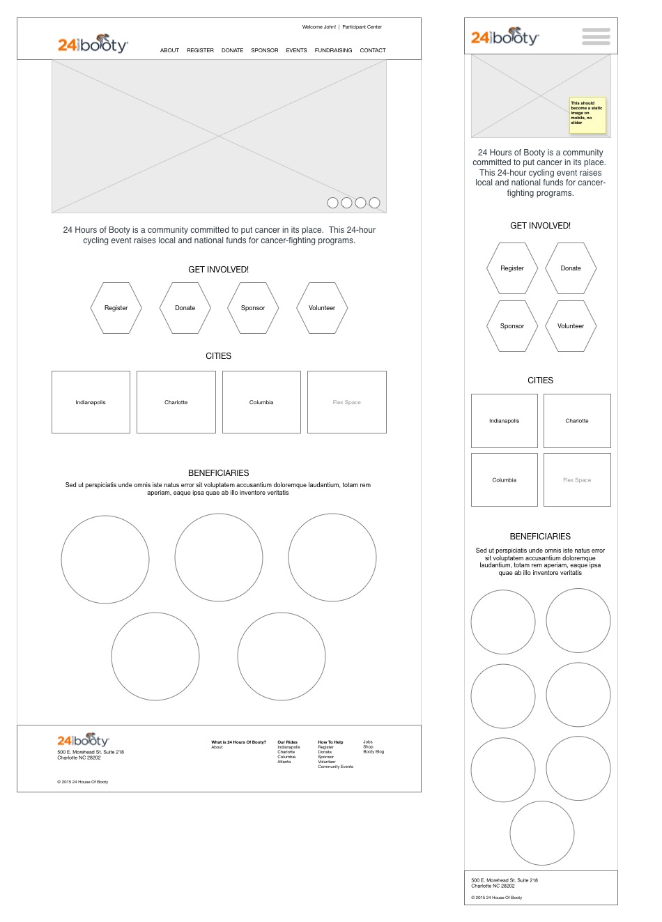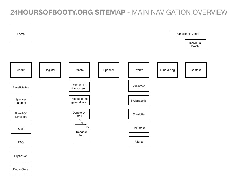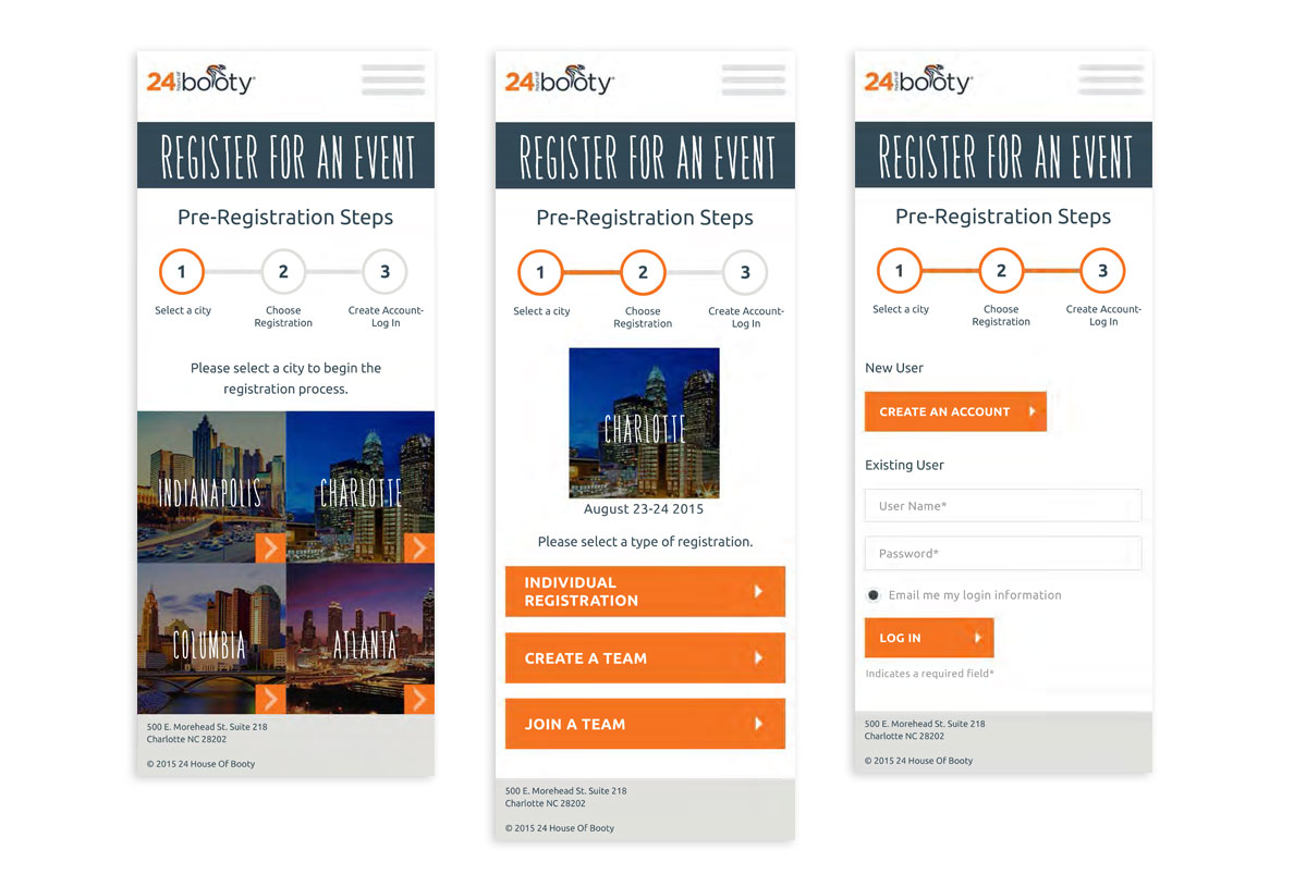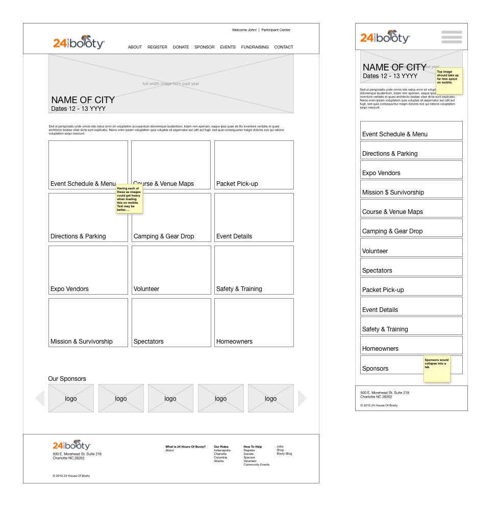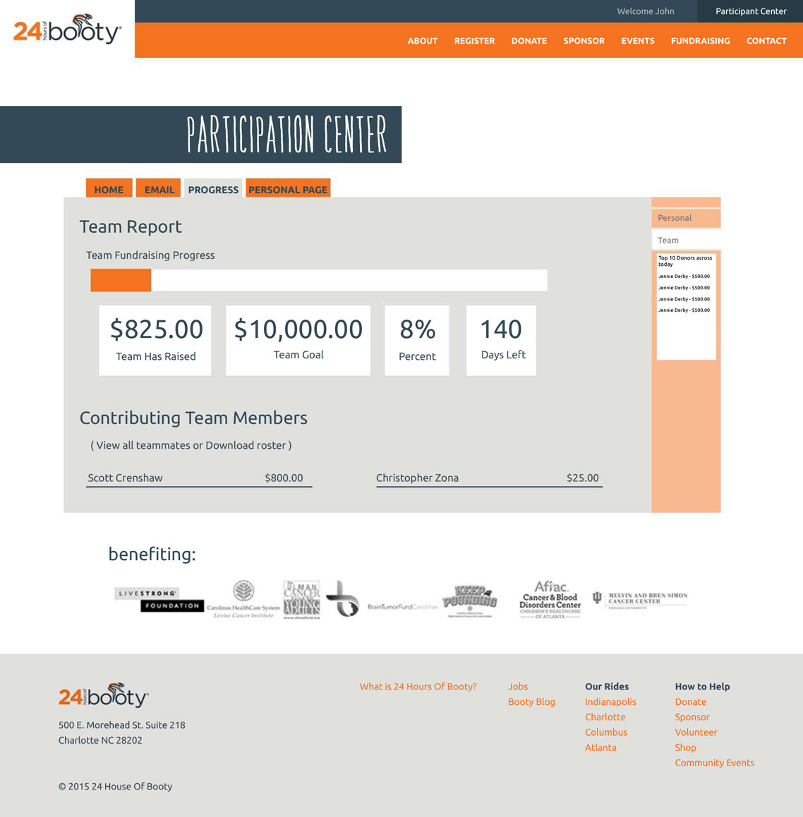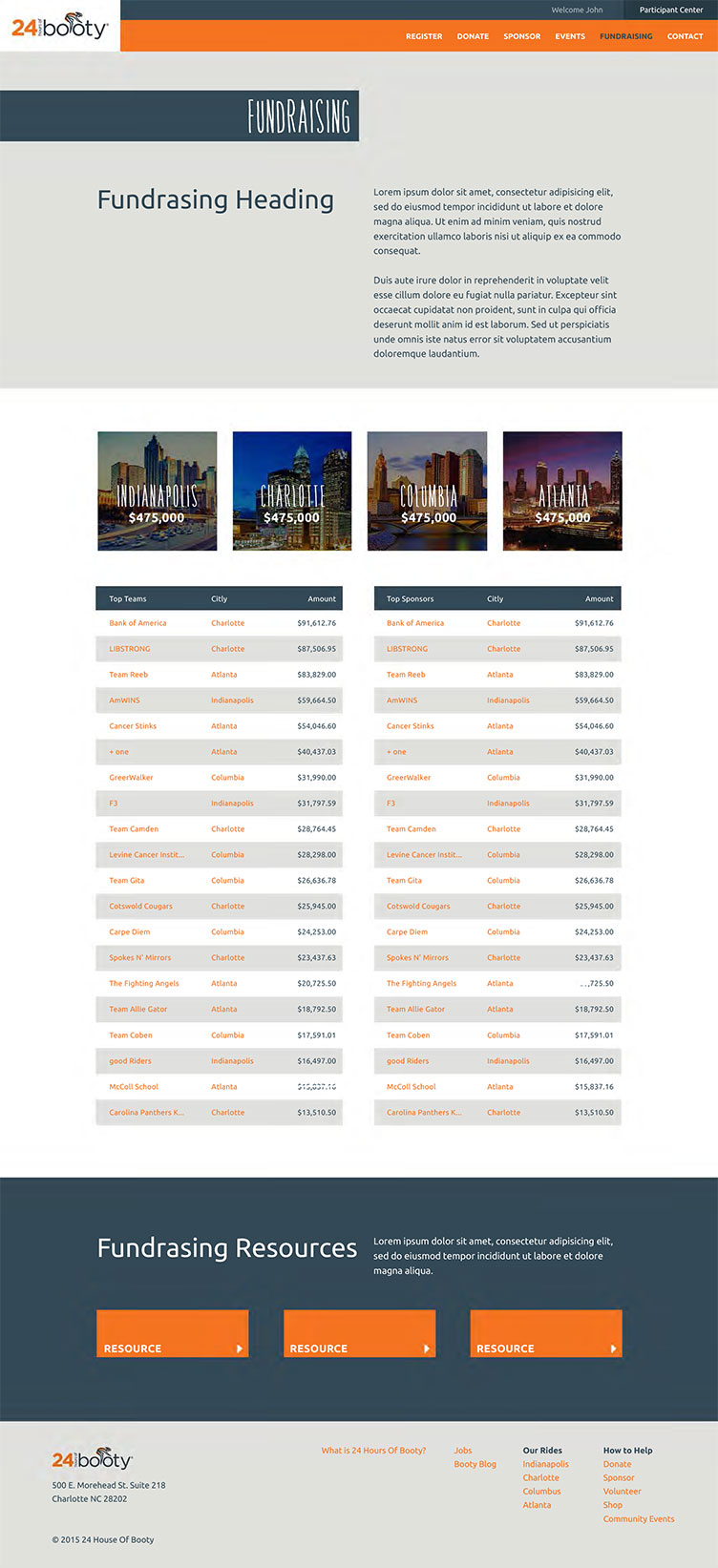 Every year, in multiple cities in the US, 24 Hours Of Booty (now 24 Foundation) raises millions to support cancer survivorship programs. But the site had become overgrown with content, and therefore frustrating to use. I was asked to fully redesign the entire experience.