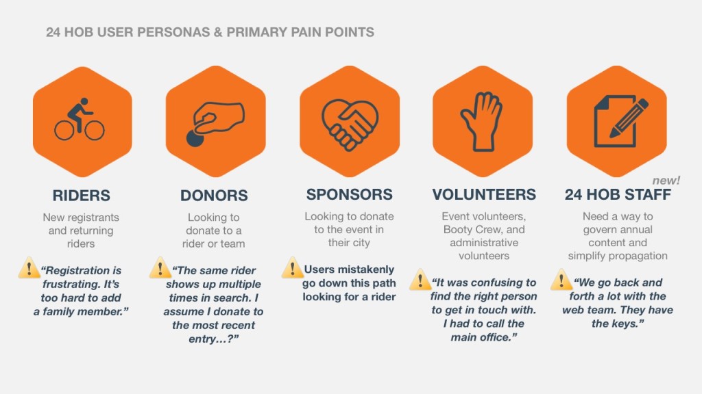 People came to the site to register, donate, sponsor, volunteer, or get info about their city’s event. Those paths were now front and center.